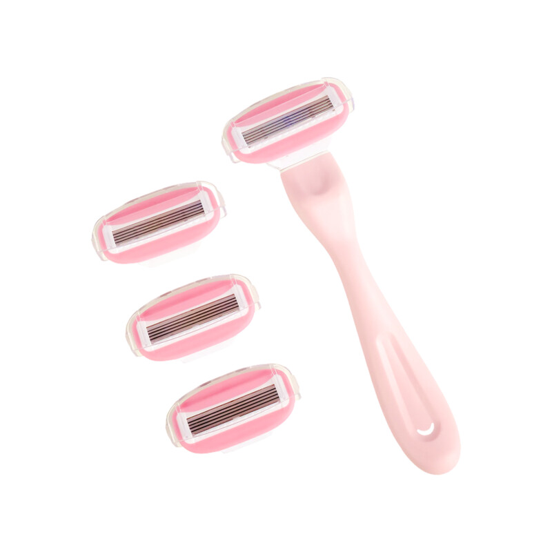 1 reusable long handle with 4 refill cartridges, one set for everyday shaving.